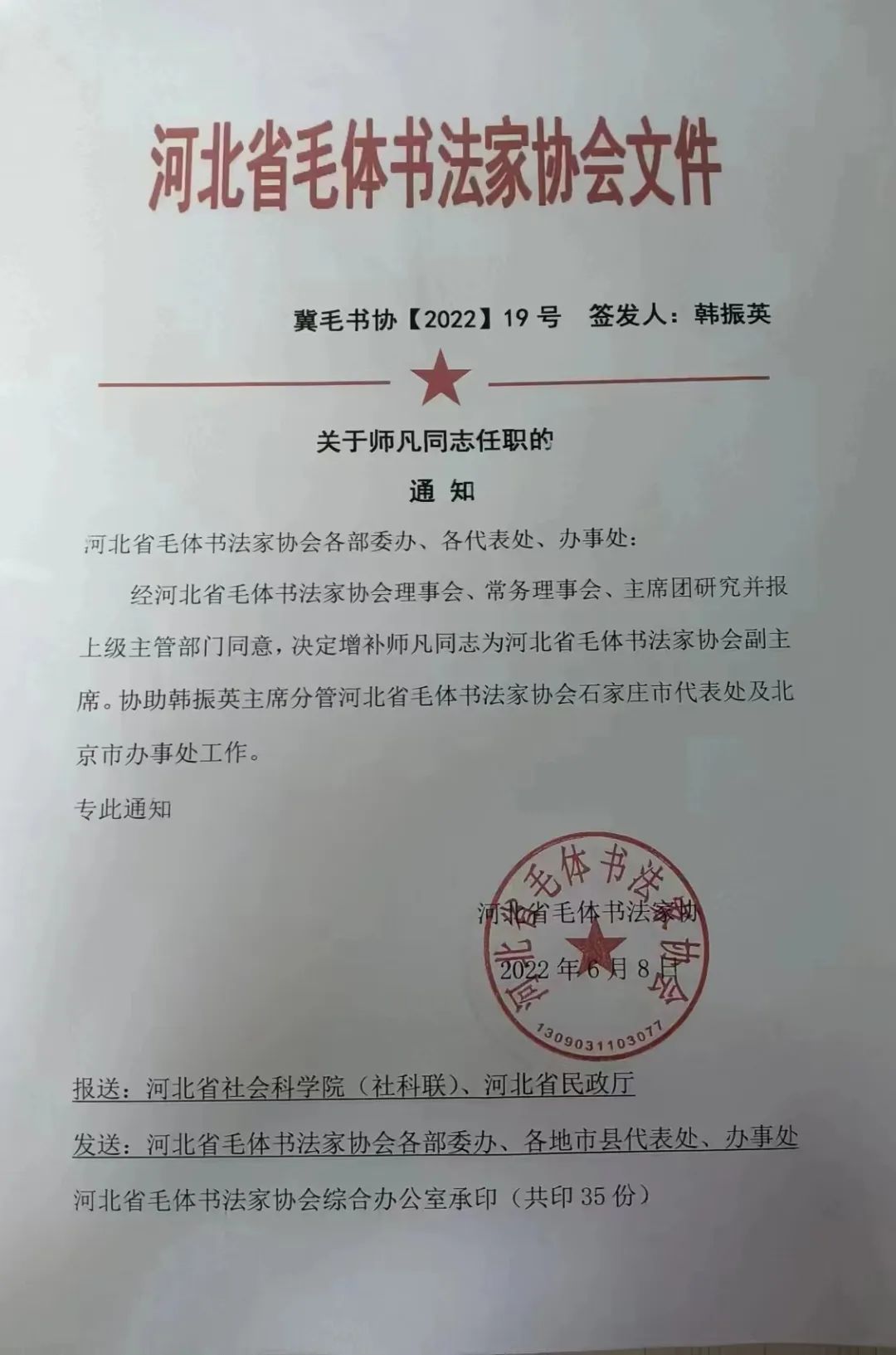 近日,经河北省毛体书法家协会理事会、常务理事会、主席团研究并报上级主管部门同意,决定河北同创…