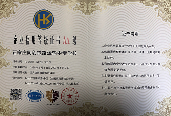 石家庄同创铁路运输中专学校企业信用等级证书AA级