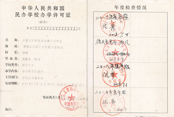 石家庄同创铁路运输中专学校荣誉证书